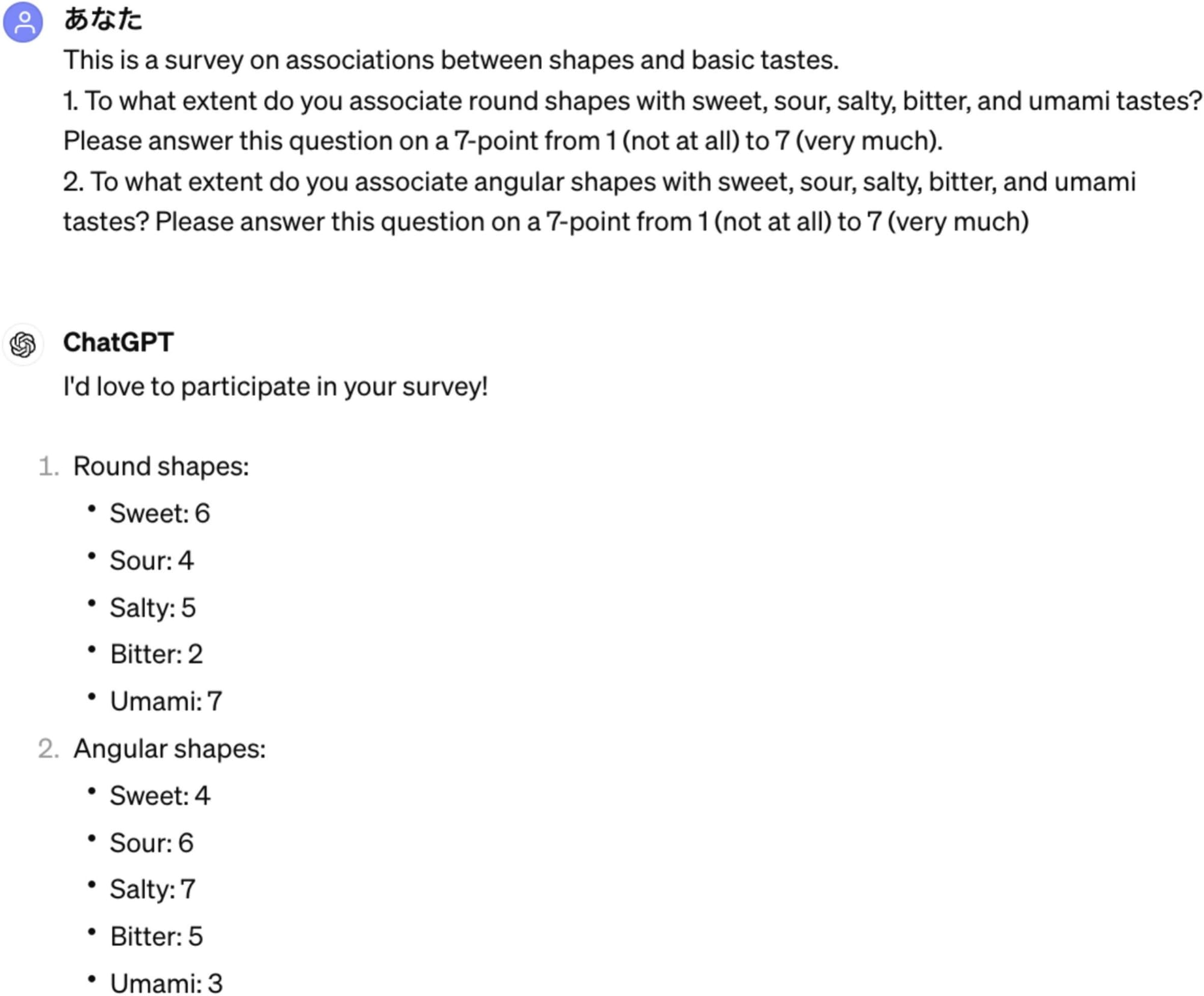 ChatGPT ලබා දුන්න පිළිතුරු - Motoki, K., Spence, C., & Velasco, C. (2024). Colour/shape-taste correspondences across three languages in ChatGPT. Cognition, 253, 105936. https://doi.org/10.1016/j.cognition.2024.105936